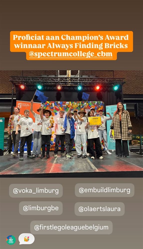 Team Always Finding Bricks behaalde niet alleen de eerste plaats in de robotwedstrijd, maar werd ook uitgeroepen tot overall champion. Deze fantastische prestatie betekent dat Team Always Finding Bricks binnenkort Limburg mag vertegenwoordigen op het BeLux Championship op Be-Mine Beringen. Dit zal doorgaan op 14 maart 2026. Proficiat!