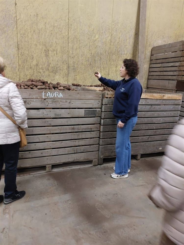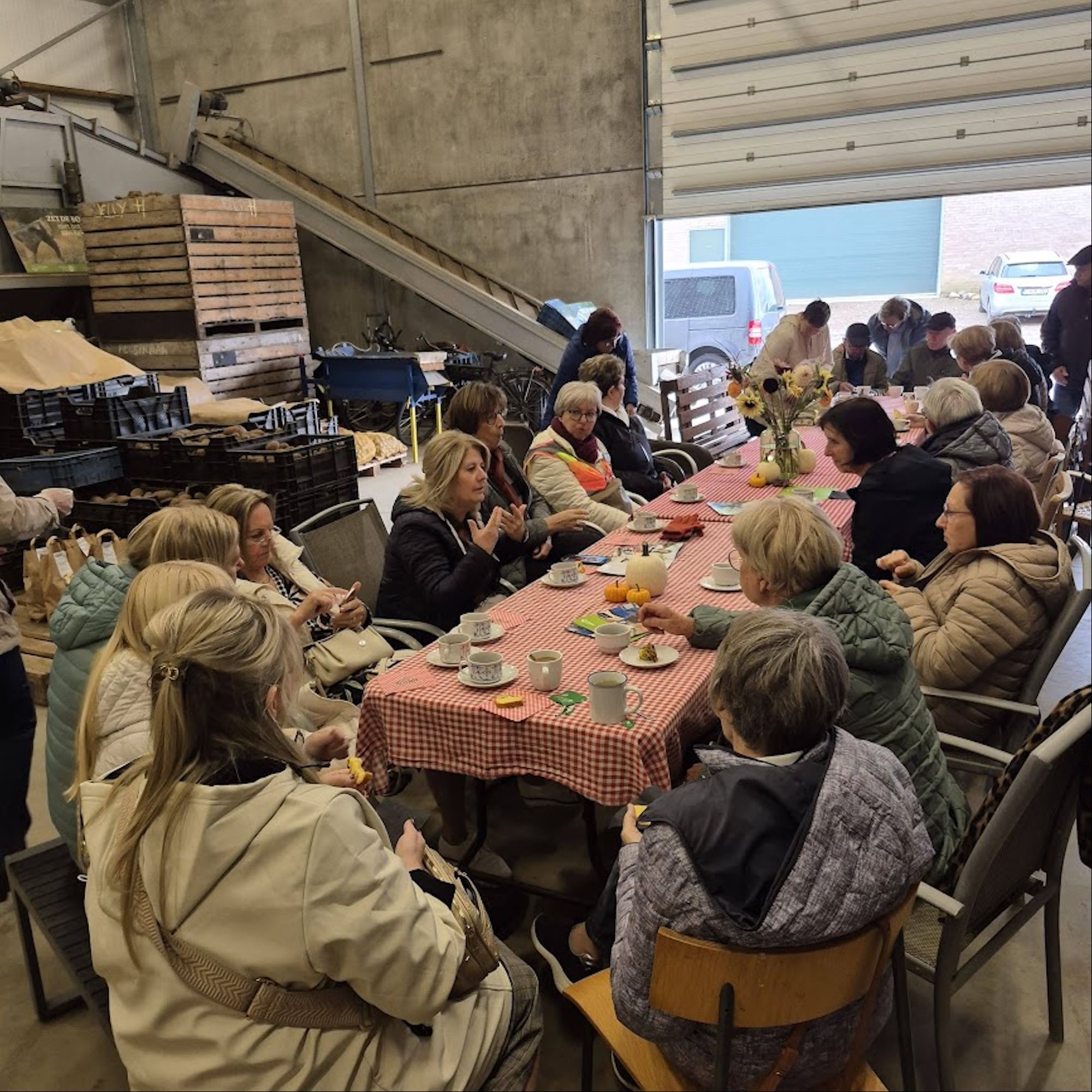 Hoeve Machiels in Beverlo. Ze werden er hartelijk ontvangen door gastvrouw Ann. Zij leidde de groep rond doorheen het bedrijf en gaf uitleg over de verschillende machines. Ze vertelde over de teelt van uien, bieten, kruiden en granen, maar vooral de enorme berg aardappelen was indrukwekkend. Het hele proces van planten tot rooien, drogen, sorteren en bewaren werd uitgelegd.
