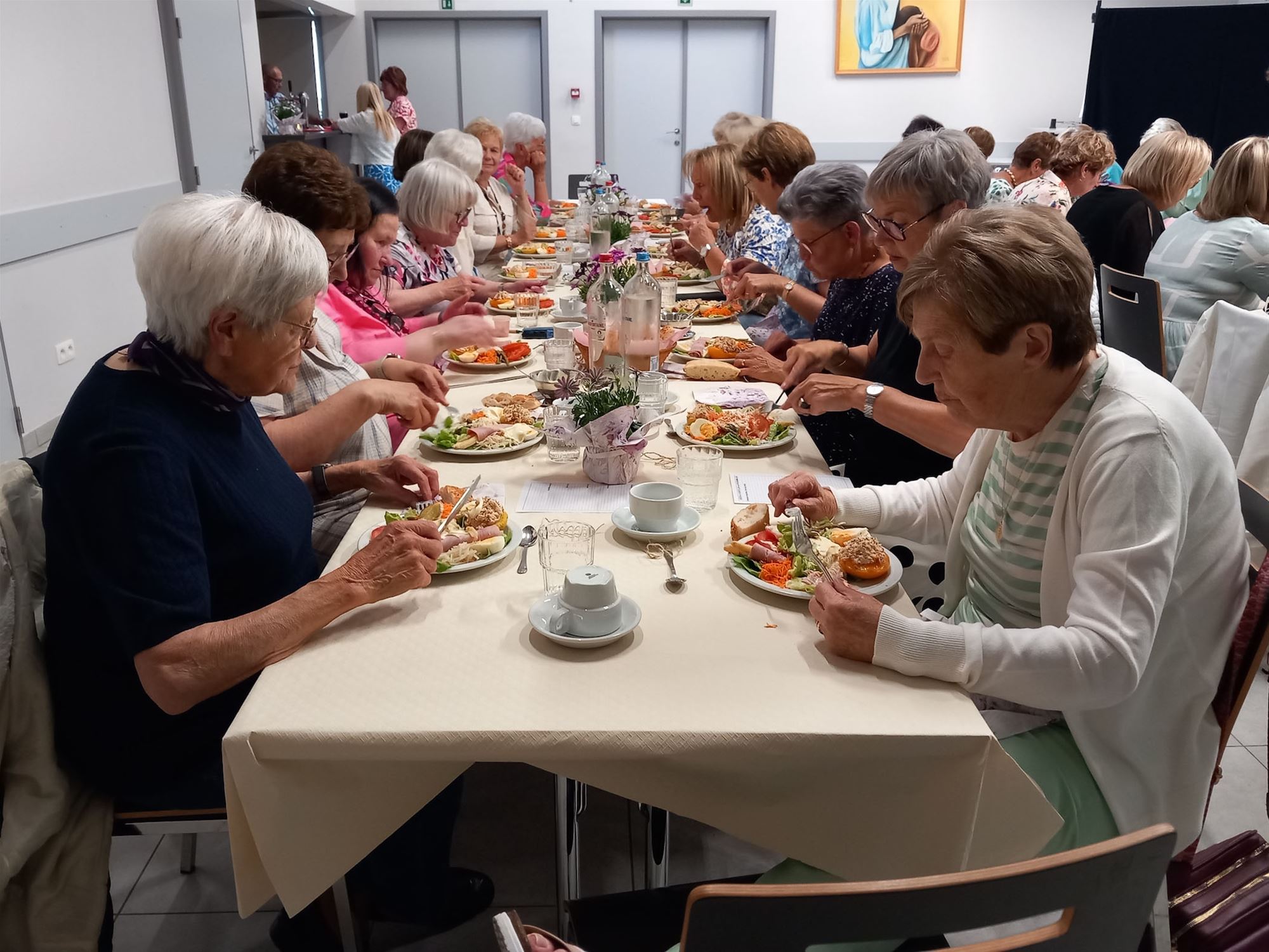 Na een korte bezinning rond de kracht van de vrouw en het sterke hart van een moeder, werden nog enkele praktische mededelingen meegegeven. Dan werd er een goedgevulde koude schotel opgediend. Boer Martijn zorgde nadien voor de animatie: zijn stemmige liedjes nodigden sommige dames uit tot dansen. Tussendoor vertelde hij ook enkele mopjes. Gaandeweg kwam de sfeer er goed in.