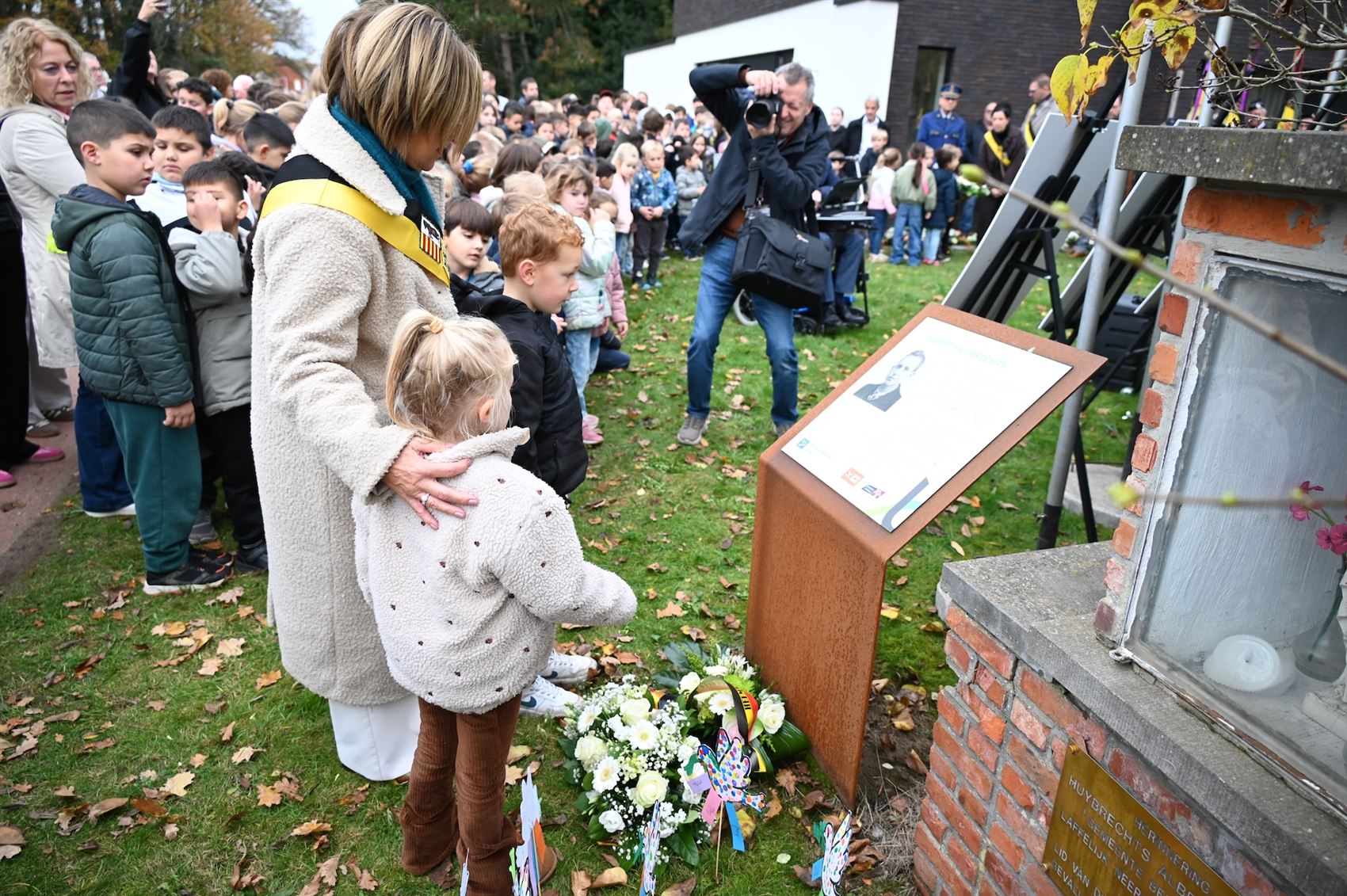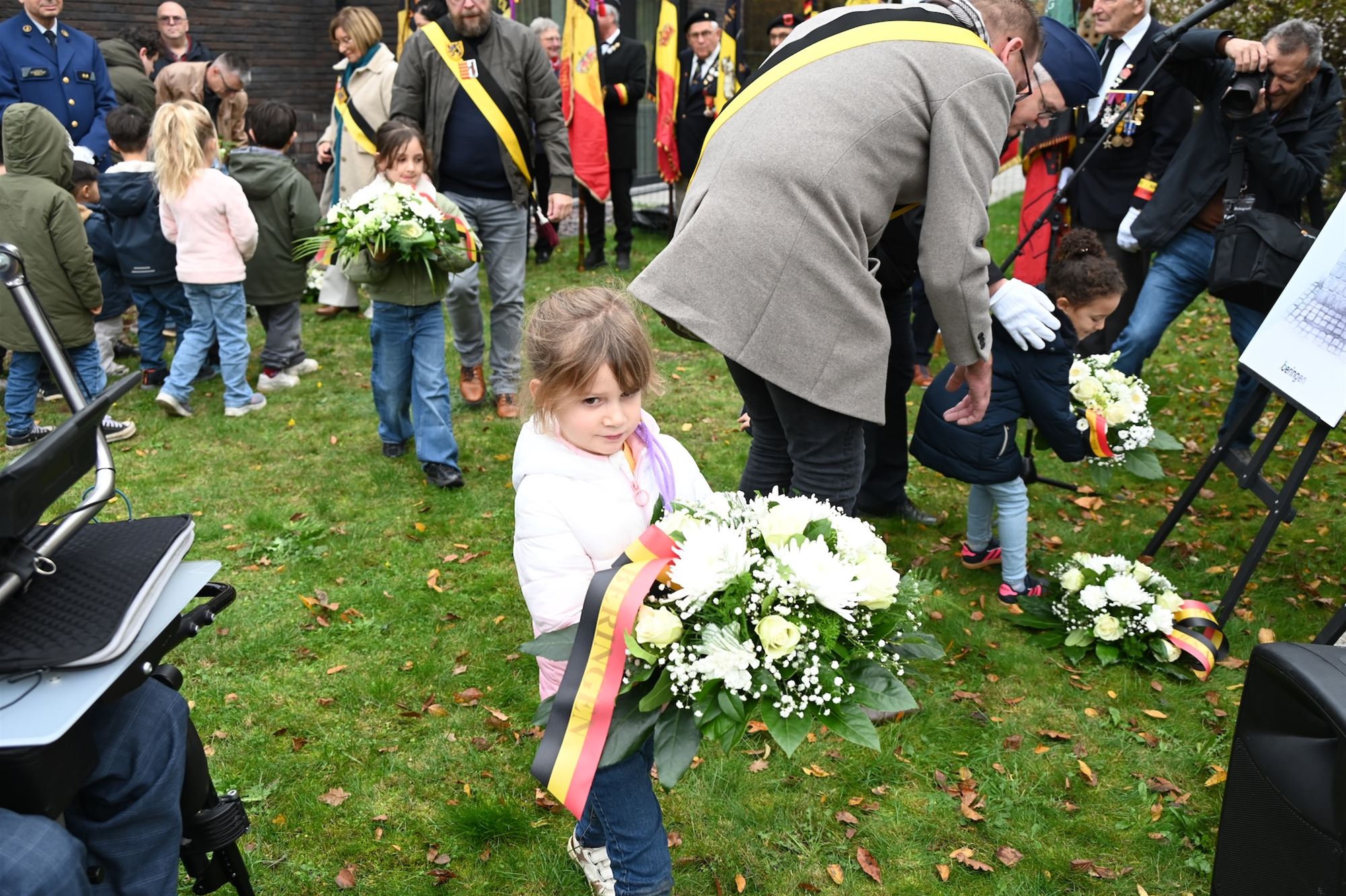 De kleuters maakten in de aanloop naar de plechtigheid kaarsen, de leerlingen van de lagere school brachten vredesduiven en gedichten, en de derde graad zong het volkslied.