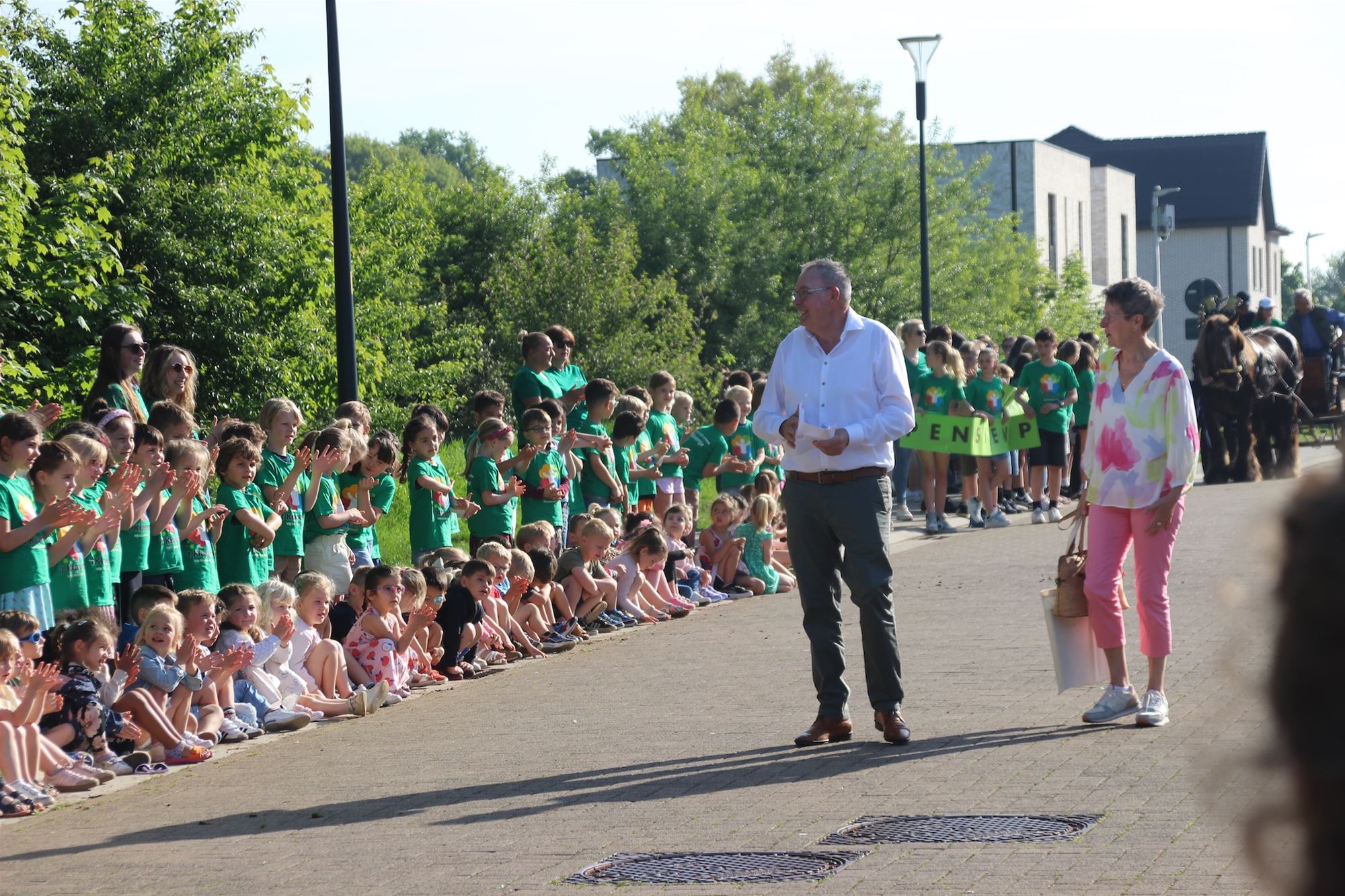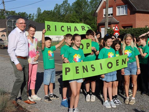 Richard Vanhoudt, directeur van 't Klavertje in Koersel, om afscheid te nemen van de leerlingen, de leerkrachten en de school. Dit kon het team niet zomaar voorbij laten gaan. Ze hebben dan ook gezorgd dat de laatste werkdag er eentje was vol verrassingen. 's Ochtends werden de directeur en zijn vrouw Sylvia thuis opgehaald met paard en kar samen met de leerlingen van het 6de leerjaar. Aan de schoolpoort wachtte de rest van de school hem op. Na een hartelijke welkom en het samen zingen van het schoollied, mochten Richard en Sylvia genieten van een lekker ontbijt in de leraarskamer. Tijdens dit ontbijt kwamen beurtelings alle klassen afscheid nemen. Ze hadden allemaal een laatste attentie voor hun directeur, een knutselwerkje, een dansje, een gedichtje,... Allemaal even creatief en hartverwarmend. De voormiddag afsluiten gebeurde met een kleine receptie. Geniet van je pensioen, Richard! (