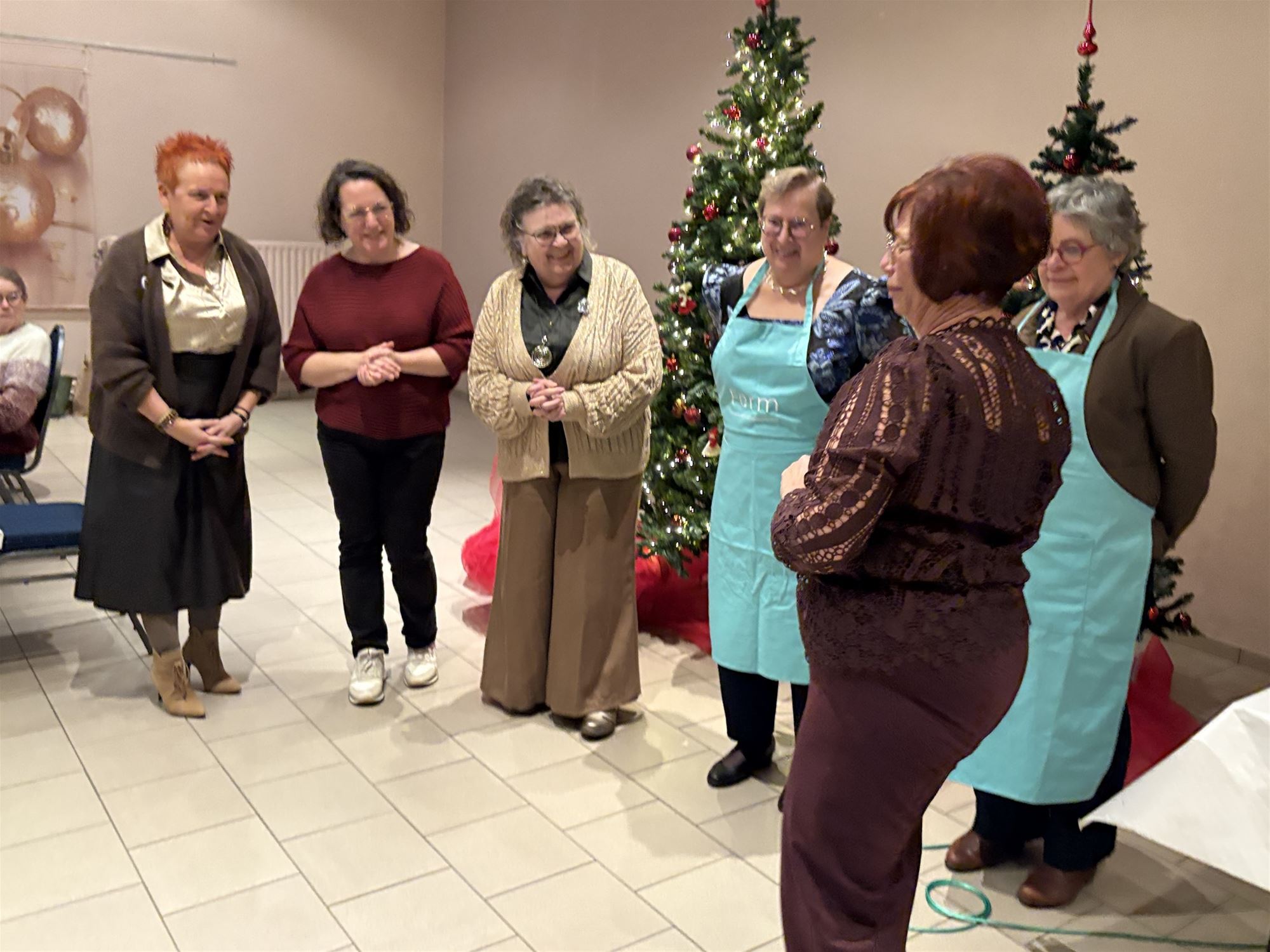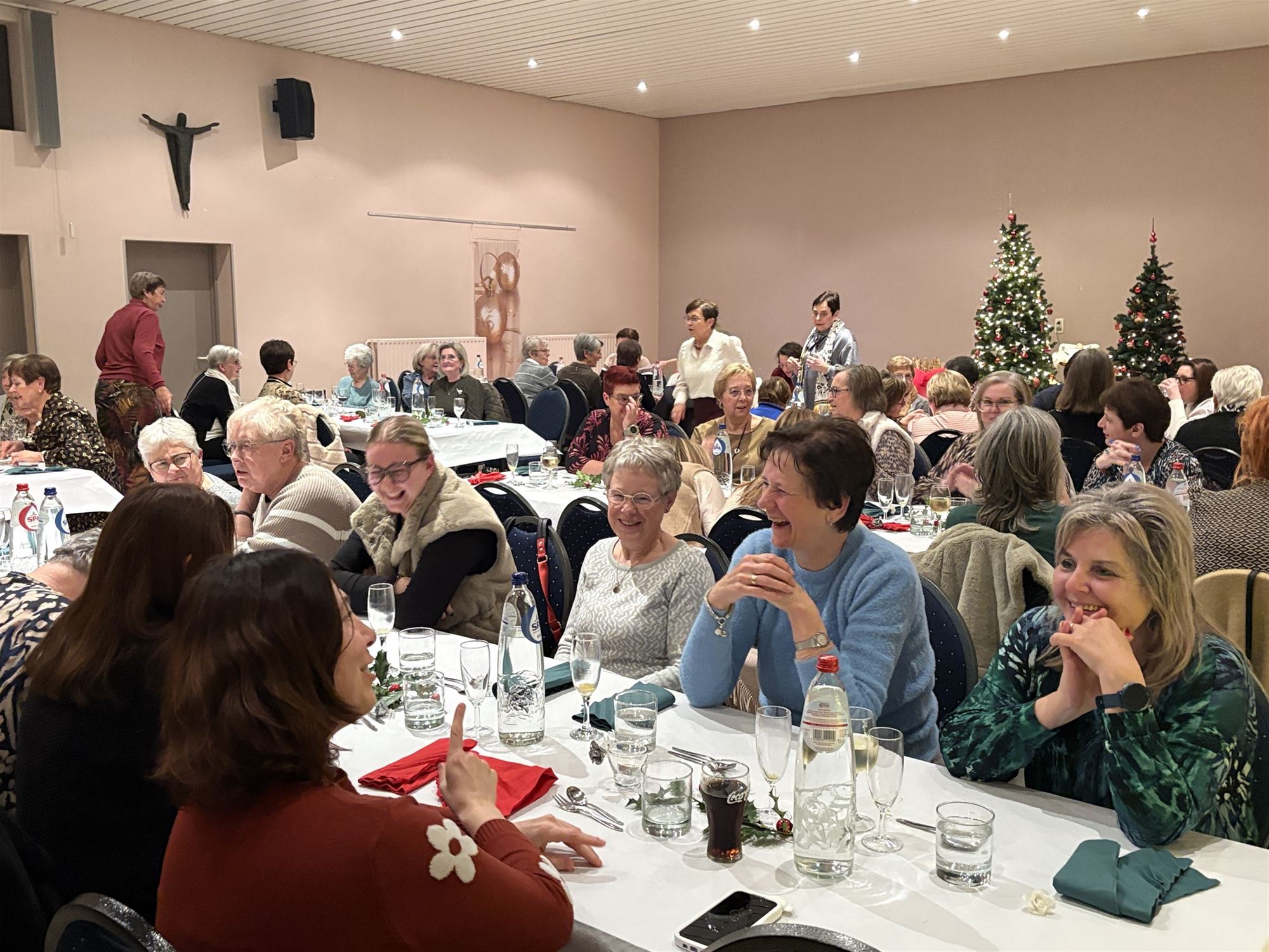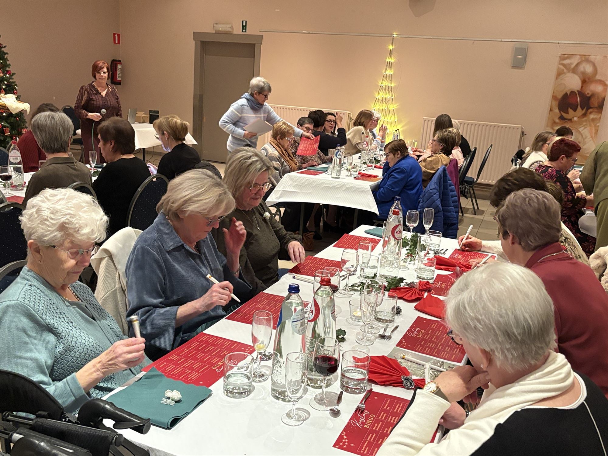 Aan een gezellige versierde kersttafel schoven 92 ferme dames aan met een glaasje bubbels in de hand om mee te genieten van het jaarlijks kerstfeest. Iedereen liet zich het kerstmaal smaken en dit jaar had het bestuur zelf voor ontspanning gezorgd. "Een kerstbingo waar de aanwezige leden uit 90 kerstliederen moesten raden waarvan de titels op de bingokaart stonden. Iedereen deed enthousiast mee en af en toe zelfs met volle borst. Wat waren ze aandachtig als ze speelden voor een middelste rij, een rij van onder naar boven om te eindigen met een volle kaart .Acht dames hadden geluk waarvan 5 ex aequo. Zij werden beloond met een keukenschort van Ferm. De avond vloog voorbij en een origineel cadeautje mocht zeker niet ontbreken. Als afsluiter een bezinning onder een adembenemende stilte. Een geslaagd warm kerstfeest waarvan we €1 per aanwezige persoon naar Limburg Ferm sturen om de warmste week te steunen. We kijken nu al uit naar de startvergadering op 27 januari om te klinken op het nieuwe jaar", vertelt Greta Cuppens.