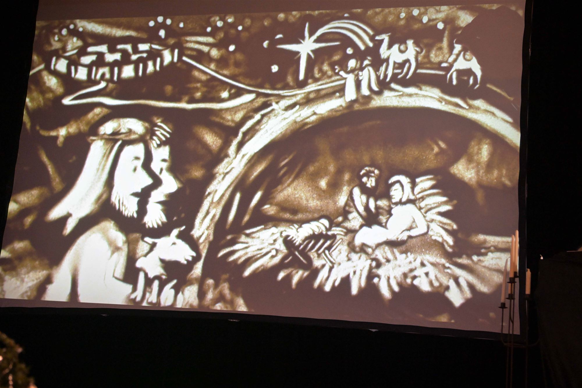 voor de zandkunstenaar die het verhaal van de geboorte van Jezus