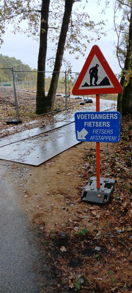 fietspad doorheen het militair domein tussen Koersels Kapellek en Hechtel-Eksel. Door die werken liggen er enkele platen voor een korte omleiding. We kregen verschillende meldingen van gevallen fietsers door de gladheid van de platen. Het is daarom extra opletten. Er staat ook een waarschuwingsbord om af te stappen. En doe je dus ook best wil je niet vallen. Eén van de gevallen personen fietste 's morgens in het donker en zag het bord niet. Daarom deze extra waarschuwing want een gewaarschuwd man is er twee waard.