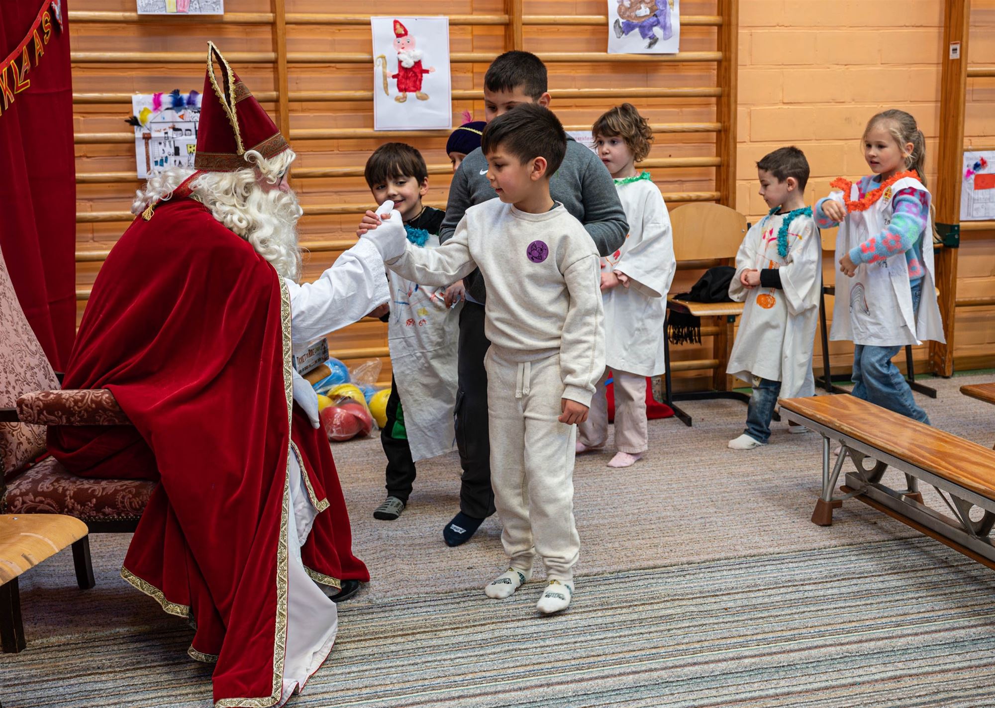 De Sint werd onder luid applaus onthaald in de school en die bracht uiteraard veel lekkers mee. (