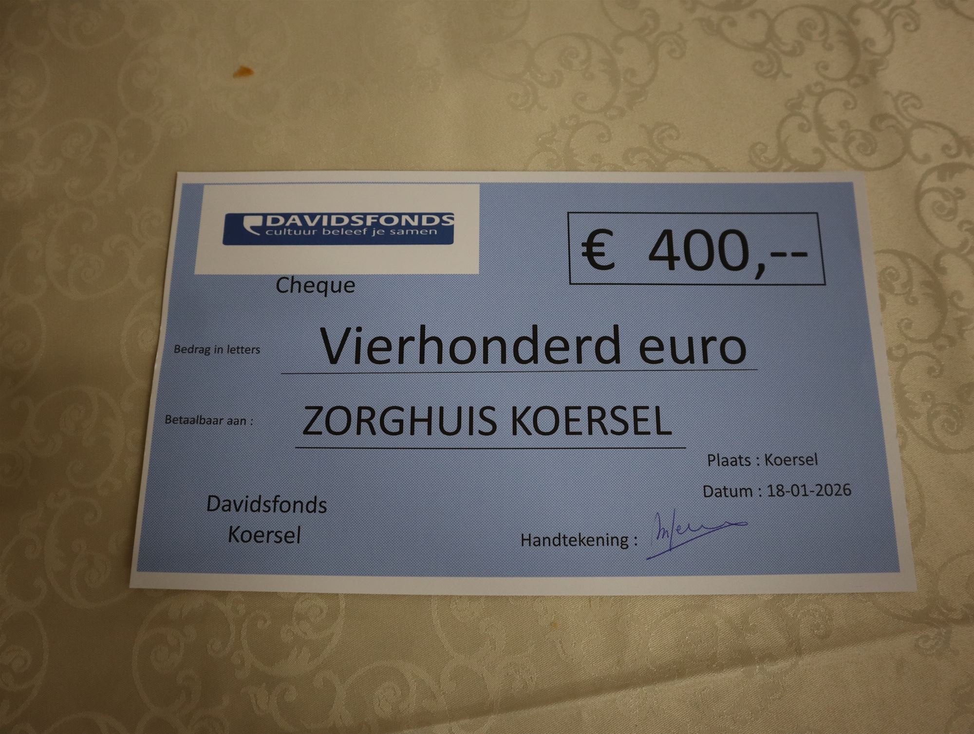 Ook mochten we genieten van een prachtig optreden van 'Broer en Broer'. Tijdens de pauze werd iedereen nog eens getrakteerd met een glaasje bubbels en een zoetje. En 'Zorghuis Limburg' mocht een cheque van €400 ontvangen, de vrije bijdrage van het kerstconcert op 28 december. Het was een warme, hartelijke en gezellige ontmoeting. Een goede start voor het nieuwe jaar. (
