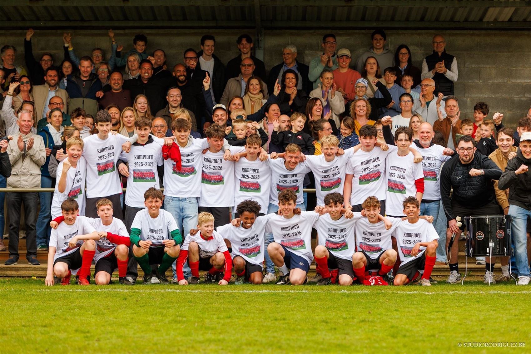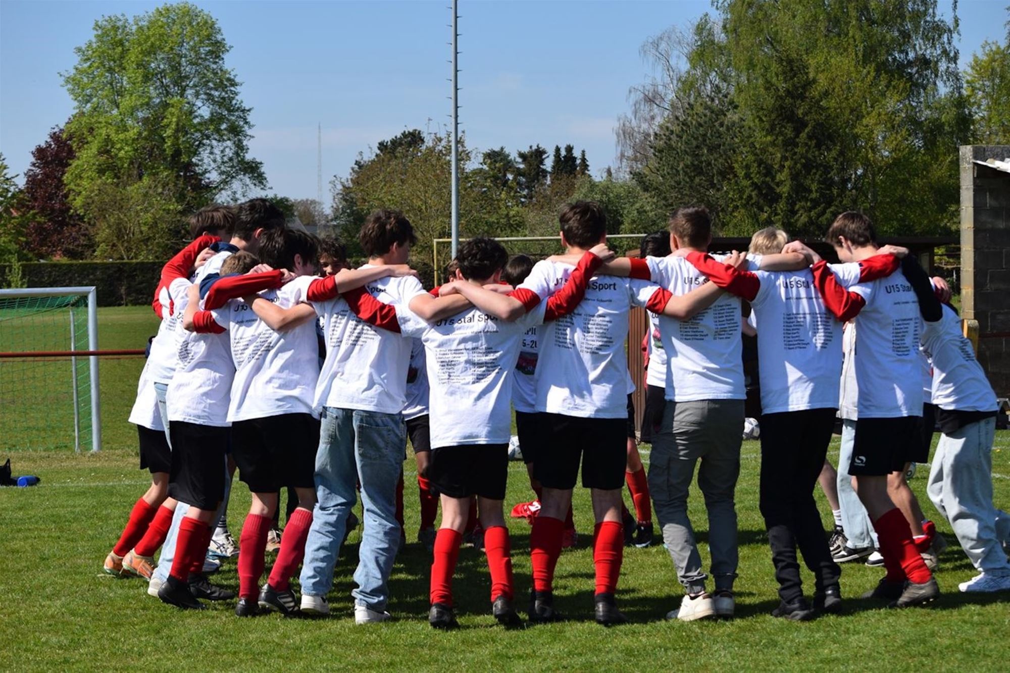 U15 Stal Sport kampioen! Met 37 punten op 42 beleefden zij een topseizoen. Er waren heel wat spannende matchen waarbij ze tot het einde hebben moeten vechten voor de overwinning. Dat maakt de ontlading achteraf eens zo groot! Ze hebben dit seizoen heel wat doorzettingsvermogen, veerkracht en teamspirit getoond. Ook de supporters moesten niet onderdoen. Deze groep ouders was altijd massaal aanwezig zowel bij thuis- als uitmatchen om de ploeg te steunen. Afgelopen zondag werd de kroon op het werk gezet met een 4-1 overwinning tegen Verbroedering Balen. Er werd nadien dan ook uitbundig gevierd. De spelers en ouders werden door het bestuur van Stal Sport getrakteerd op lekkere frietjes. (foto's