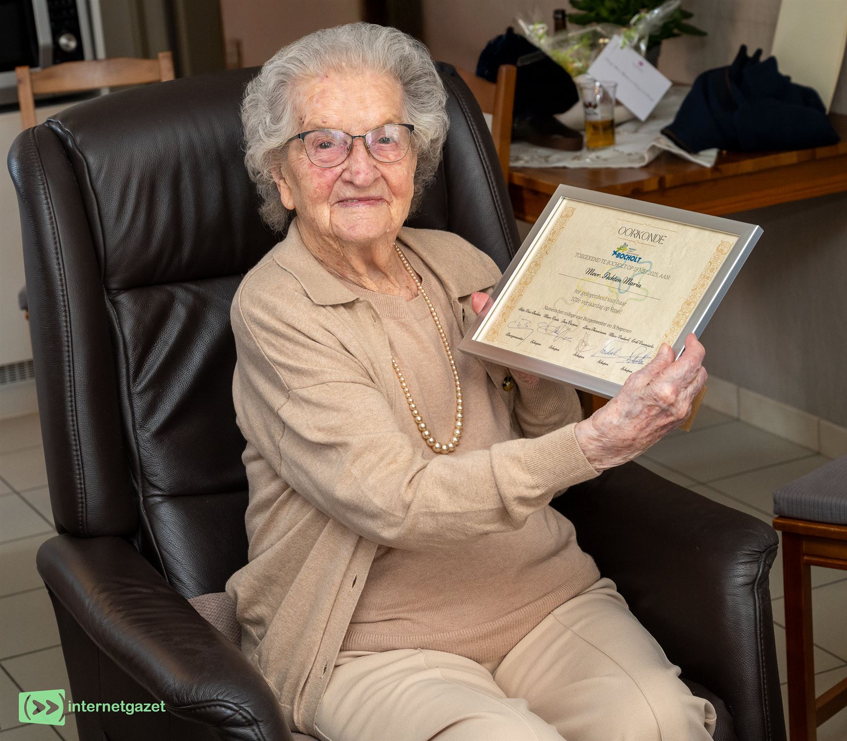 donderdag 15 mei waren we bij haar thuis, samen met vijf Bocholtse schepenen die haar kwamen gelukwensen met haar 101ste verjaardag. Leonie poseerde trots met haar oorkonde en luisterde aandachtig naar het telegram van het Koningshuis, dat door één van de schepenen werd voorgelezen.