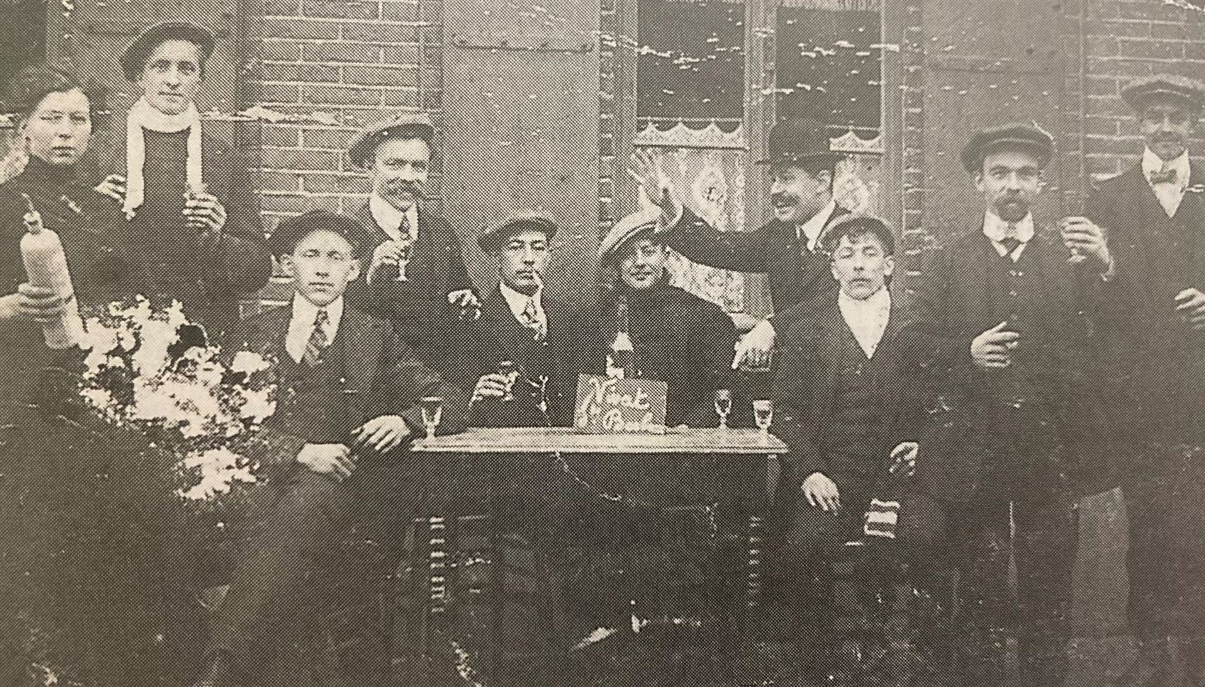 Foto: ‘Vivat Barbara’ – werknemers van Cooppal bij ‘Boeneke’ op café ter gelegenheid van Sint-Barbara (Foto: De Klaveren Heer, december 1999, Heemkunde Kaulille)