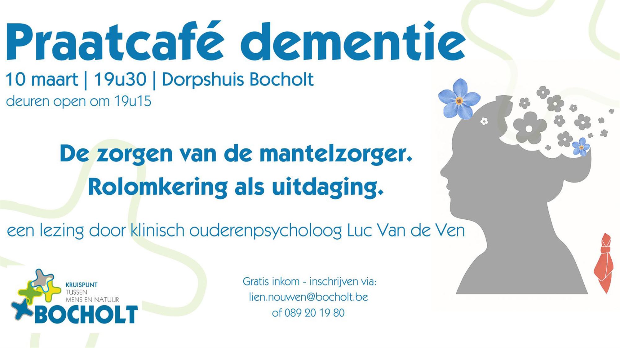 Klinisch psycholoog Luc Van de Ven komt hierover een lezing geven. Hij gaat in op de impact van dementie op de mantelzorger en hoe je met die veranderende rollen en gevoelens kan omgaan. Het praatcafé biedt daarnaast ook ruimte om ervaringen te delen en vragen te stellen.