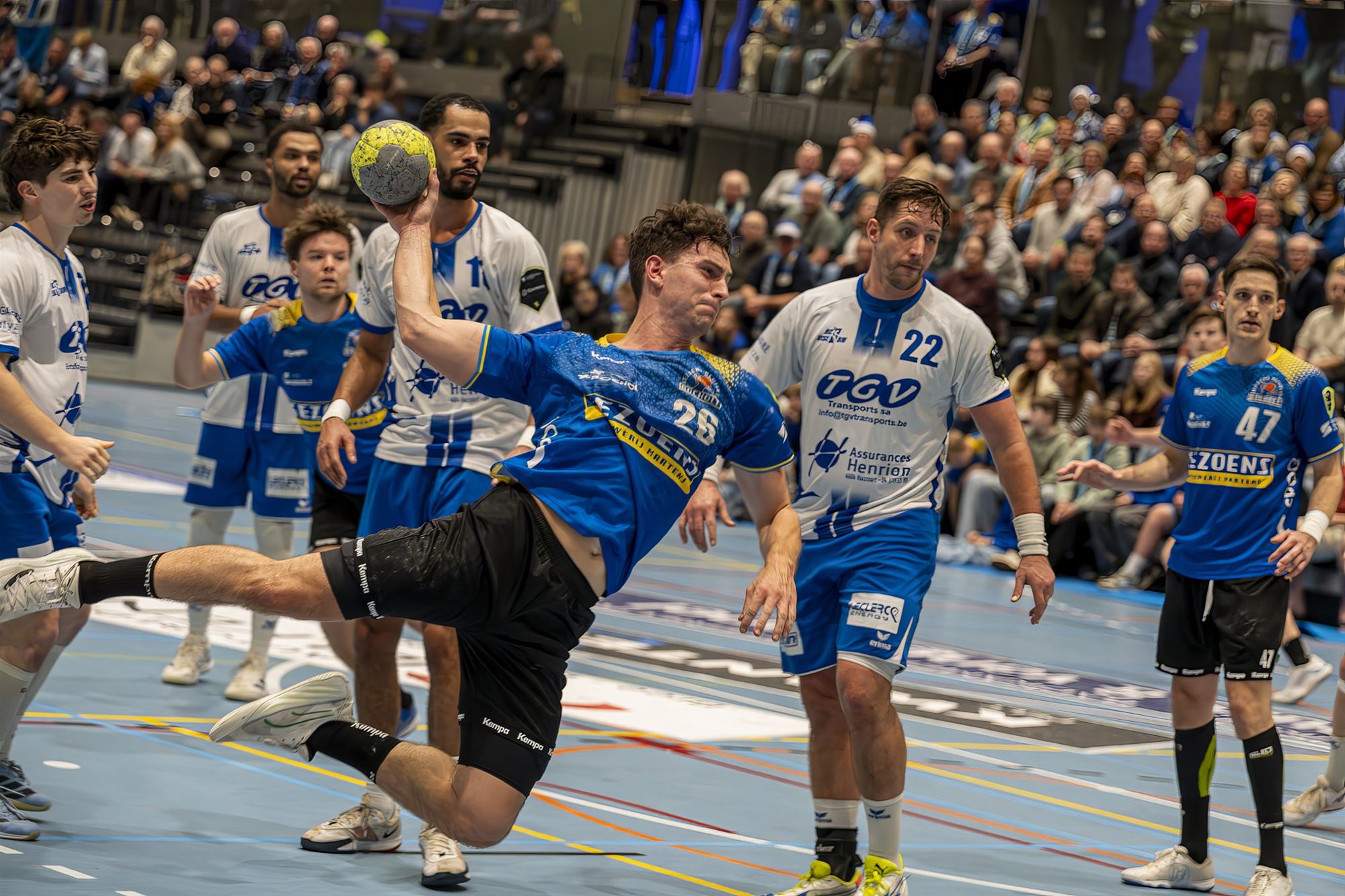 Bocholt nam meteen het initiatief en kwam via Jur Eussen en Wout Winters op een 2-0 voorsprong. Enkele technische fouten brachten Visé echter terug in de wedstrijd. Via Hamza Hadzic en Pierre Brixhe nam de bezoekende ploeg zelfs even de leiding (2-3). Daarna ging het spel gelijk op tot Yannick Glorieux Bocholt in de 19de minuut opnieuw op voorsprong bracht (10-9). In de slotfase van de eerste helft ontpopte doelman Clem Leroy zich tot uitblinker met maar liefst vier knappe reddingen. Bocholt profiteerde maximaal en ging rusten met een 17-12 voorsprong.