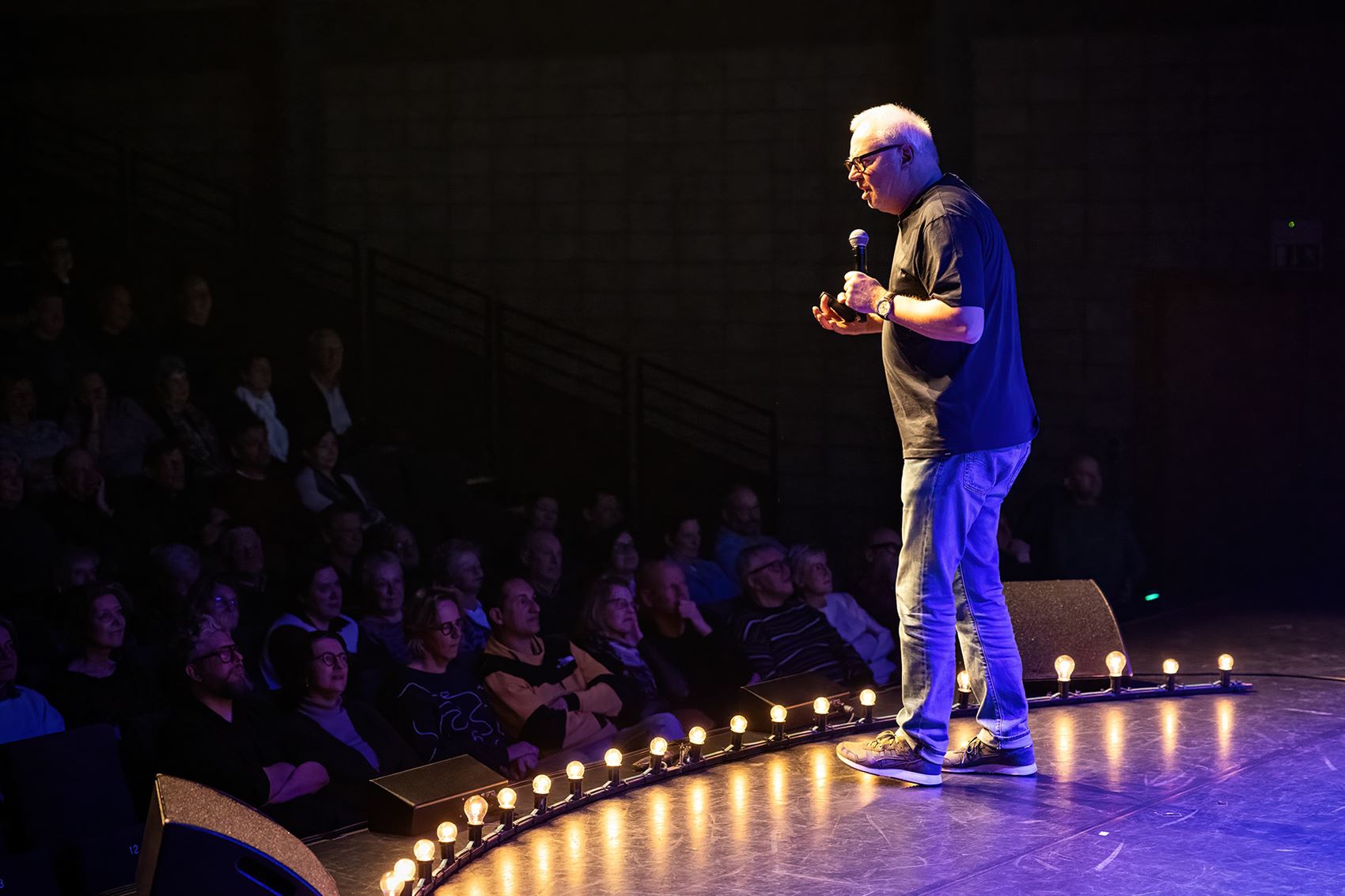 Wie hem al eens bezig zag, weet: je verlaat de zaal met zere kaken van het lachen én met een hoofd dat nét iets anders naar alledaagse dingen kijkt.