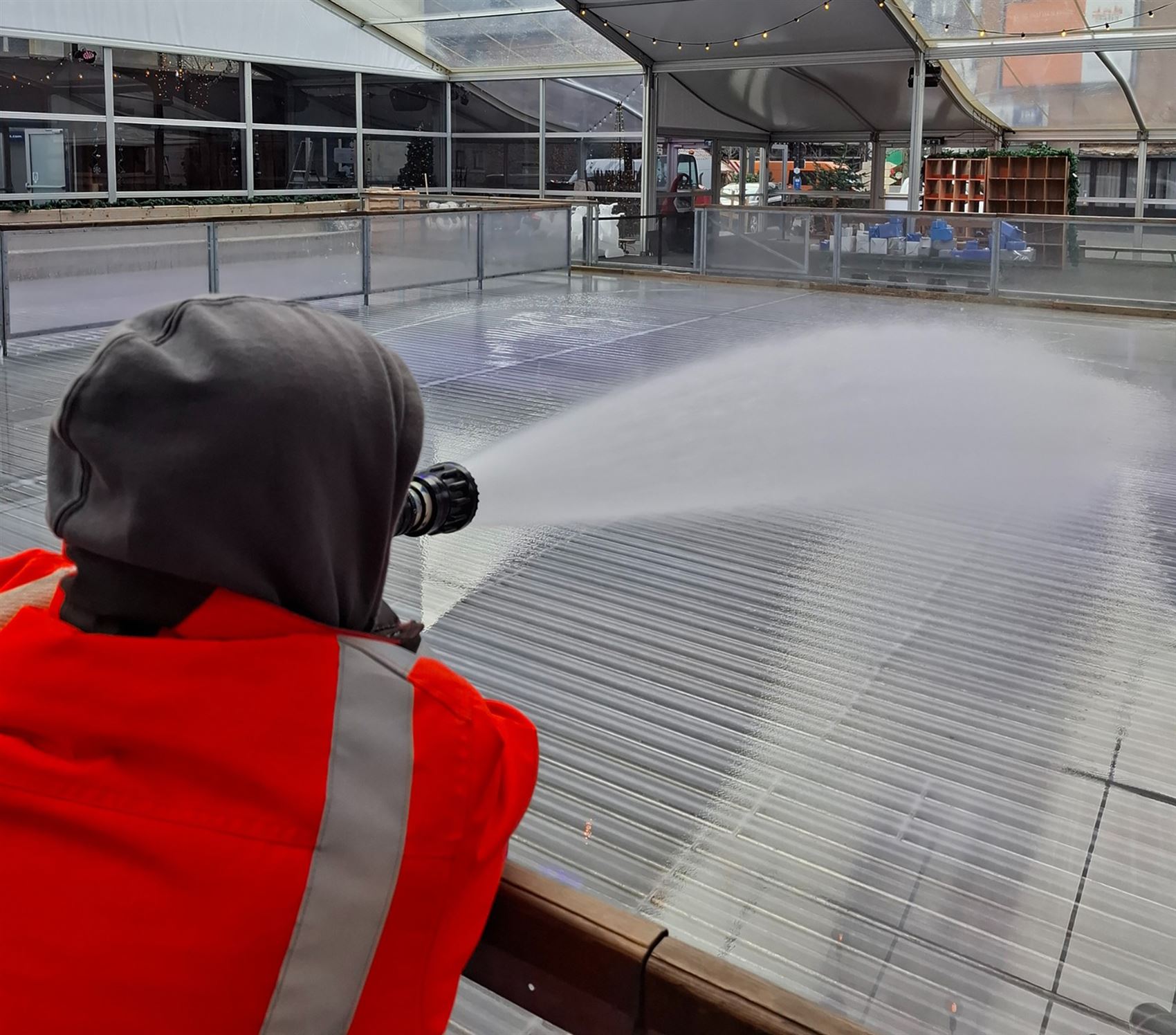 het ijs zelf. Laag na laag wordt de piste opgebouwd tot een perfect glad oppervlak waarop iedereen