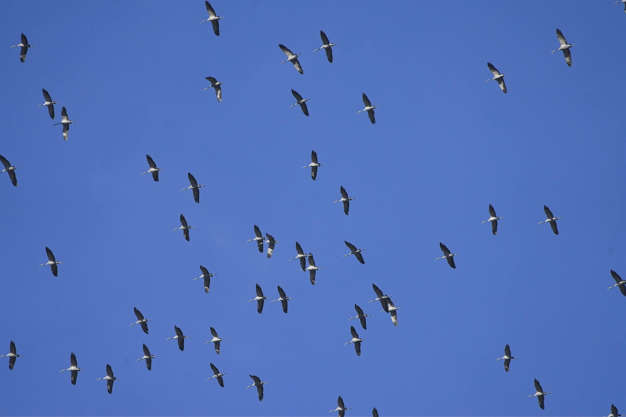 kraanvogels aan hun trek naar het hoge noorden. Opvallend was wel dat ze niet in een v-vorm vlogen, maar allemaal door mekaar. Waren ze even in de war door het mooie weer gisteren? Wie de migratie van de kraanvogels wil volgen, kan dat via deze