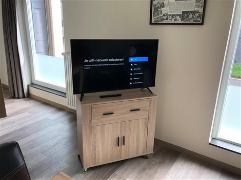 Tv-kastje op wieltjes in licht hout. Afmetingen : hoogte 70cm breedte 30 cm lengte 80 cm