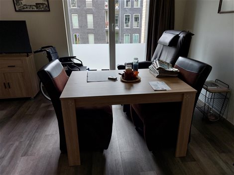 Tafel in licht hout : lengte 120cm hoogte 74cm breedte 80cm 2 bruine stoel op wieltjes