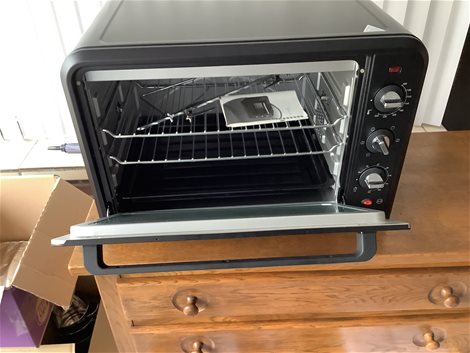 Grilloven te koop hoog 42 cm ,breed 40 cm en lengte 60 cm oven heeft draaispitschakelaar ,omkeerbare grillrooster ,ovenschaal , draaispit en binnenverlichting .