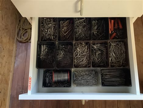 Te koop allerlei soorten nagels , schroeven enz gesorteerd in 40 bakjes van harde plastic