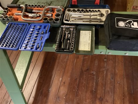 Te koop drie koffers met dopsleutels (Chrome vanadium ) een koffer met allerlei bits en een zak met compressor om banden op te pompen werkt langs de sigaretten aansteker , alles voor 50 euro .
