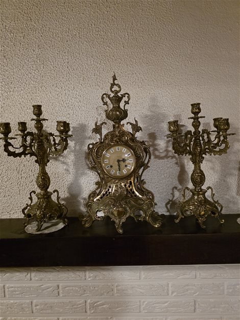 Koperen schouwklok met romeinse cijfers en twee koperen kandelaars. Hoogte +/- 50 cm