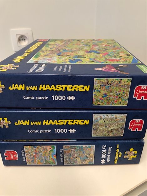 3 legpuzzels Jan van Haasteren 1000 stukjes Highland games€10 1000 stukjes hondenparcours €10 2x 1000 stukjes de muziekwinkel en vakantiekriebels €14