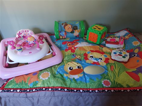 Te koop mooie speelmat, loopwagentje en speelgoed voor een baby van 0 tot 1 jaar. Alles in goede staat.