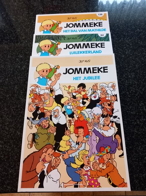 Aangeboden : 3 nieuwe strips van Jommeke 1 x : Het bal van Mathilde ( nr 126 ) 1 x : Luilekkerland ( nr 62 ) 1 x : Het jubilee strip