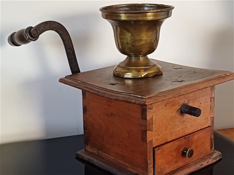 Antieke koffiemolen, afkomstig uit oude buurtwinkel. Deze werd gebruikt om de koffie voor de klanten te malen. Met lange hendel in gietijzer. Lade vooraan.