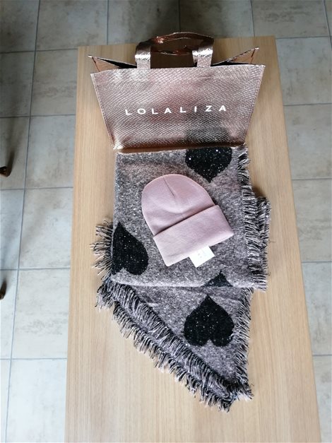 Sjaal met print + muts + tas. LOLA & LIZA. Nieuw! Sjaal afmetingen: 190 cm x 70 cm. Draagbaar: 2 zijden. Afwerking met pailletten en hartjesmotief. Materiaal: 100% viscose. + Muts: one size. 100% acrylic. + Geschenktas.