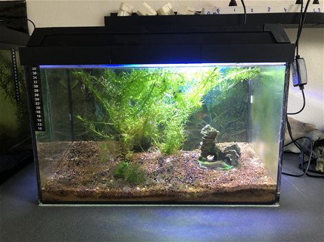 Aquarium, met zelfgemaakte kap, voorzien van ledlicht. Met verwarming en voedingsbodem, plant en ornament. (zoals op de foto afgebeeld is) lengte 45 cm breedte 28 cm hoogte 32 cm met kap. Doe een serieus bod.