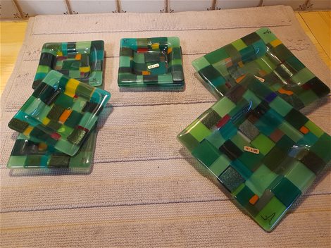 vierkant glazen bordjes 6stuks 11cm.X11cm. 2 stuks 17cm.X17cm.