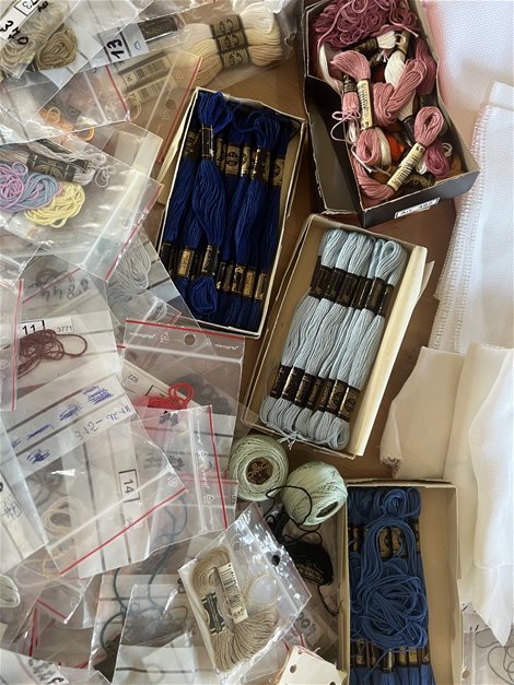 Heel veel verschillende kleuren dmc garen stukjes stof en linden voor te borduren . Boekjes met plannetjes. 2 bavetjes voor te borduren