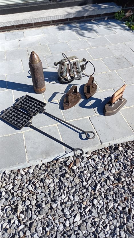 strijkijzers (één elctrisch),oude broodrooster,ledige obus 1917,wafelijzer