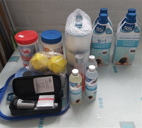 Producten voor jacuzzi 8 V1 filter 2 flessen 5 in 1 aqua pur 2 flessen schuim verwijderaar 4 flesjes geurtjes 1 kg: schokjavel 1 pot 20 grams chloor tabletten, langzaam werkend PH meter 1 water thermometer 1 zeef