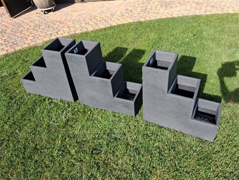 3 st ongebruikte bloembakken, 60 cm hoog, 60cm langen 28 cm breed. prijs: €10/st en €25 voor alle 3