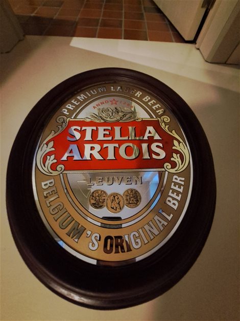 Decoratieve spiegel Stella Artois in ovalen kader, café decoratie. In uitstekende staat. Voorzien van ophangbeugel. Afmeting: 48x59 (inclusief kader) Ideaal voor een mancave of buitenbar Enkel ophalen (wegens breekbaar bij verzending).