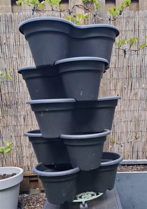 Te koop wegens verhuis stapeltoren met 5bakken en staander op wieltjes.