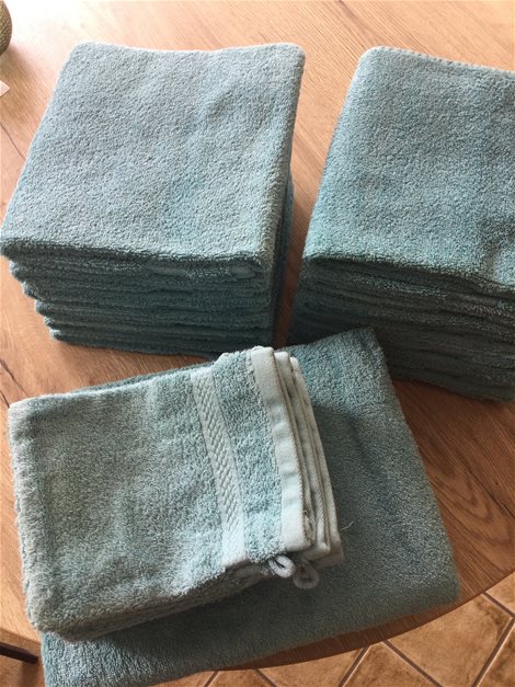 12 handdoeken van 50x100 en 2 badlakens van 70x140. Daarbij 12 washandjes. In de kleur groen/blauw van hotelkwaliteit.