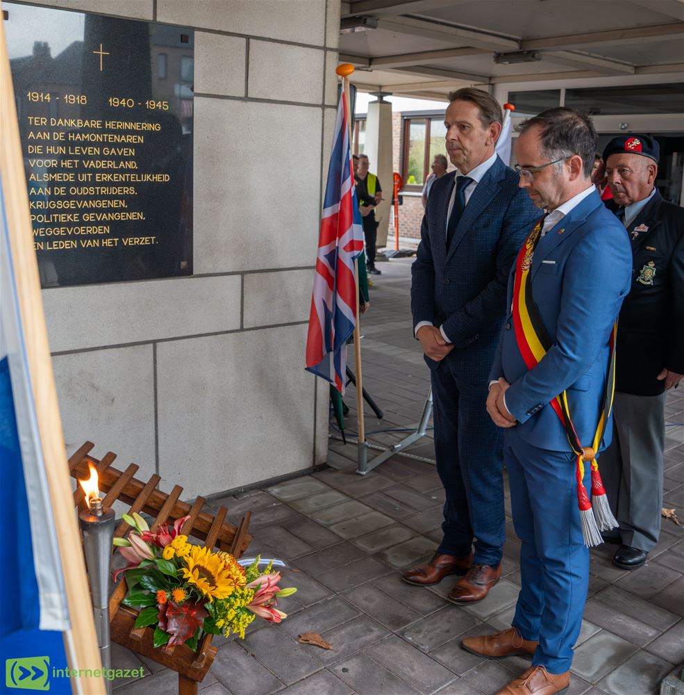 Na deze toespraken legden beide burgemeesters namens hun gemeenschappen een bloemstuk neer bij de gedenkplaat. Namens het RAF Memorial Hamont-Achel deden ook Koen Voortmans en Bram dit. Vervolgens werd door alle aanwezigen één minuut stilte in acht genomen. Daarna bracht de trompetist The Last Post, gevolgd door de volksliederen van Nederland en België.