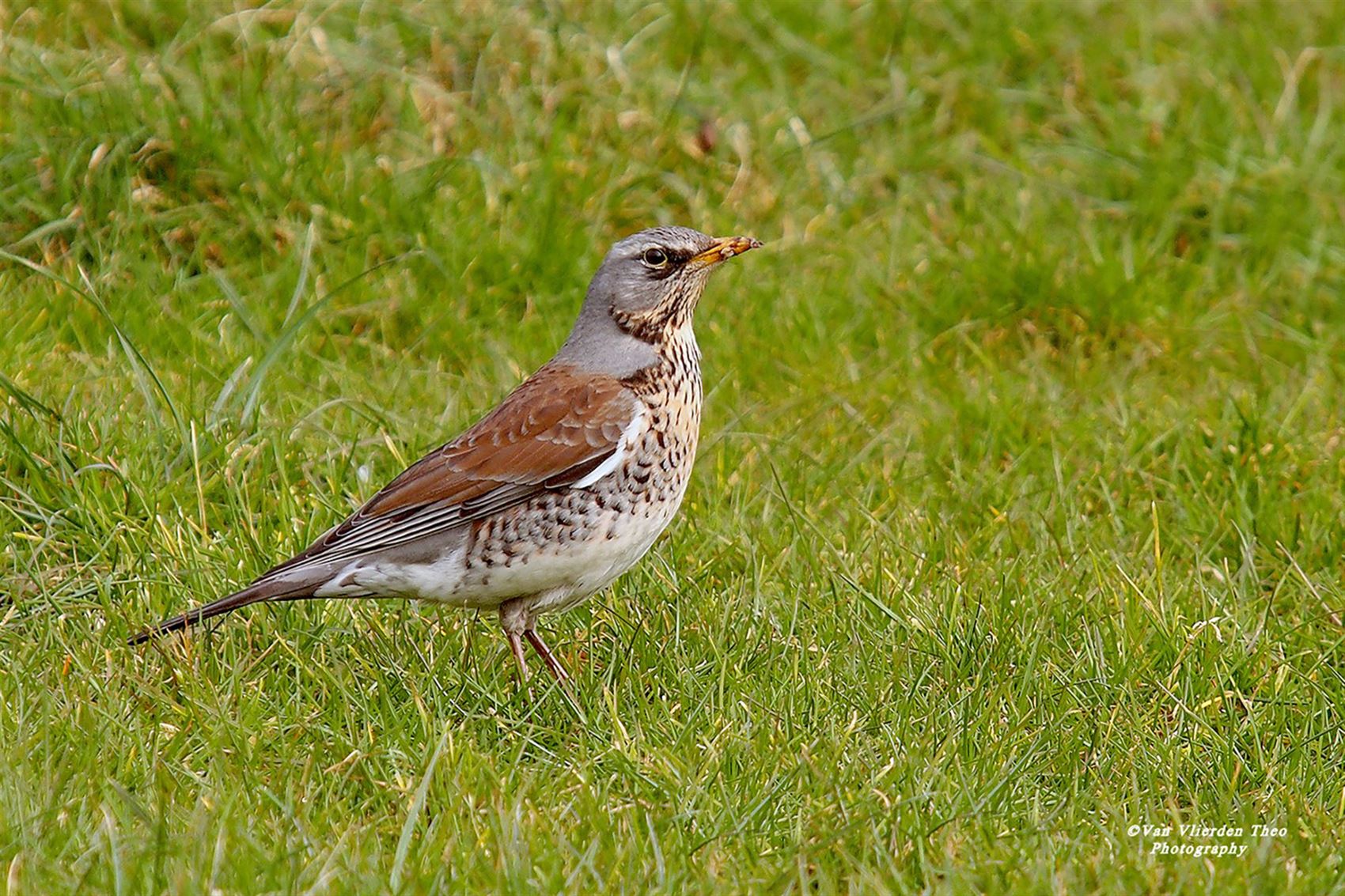 op foto vastleggen in een wei in Achel. De kramsvogel – herkenbaar aan zijn grijze kop, bruine rug en gespikkelde borst – is een wintergast die vaak in groepjes op zoek gaat naar bessen of wormen in vochtige weilanden.