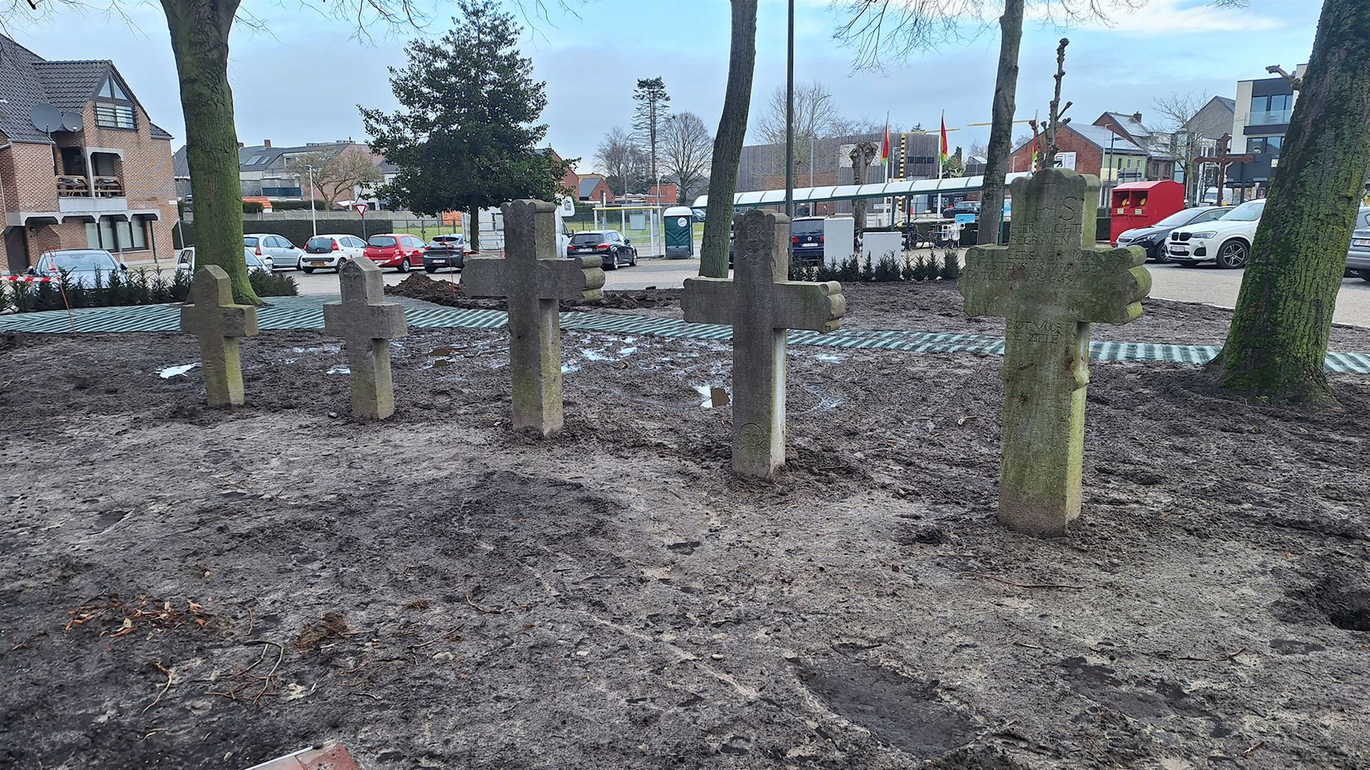 Nu zijn deze vijf grafkruisen netjes op een rij, vrijstaand, aan de oostzijde van de kerk herplaatst.