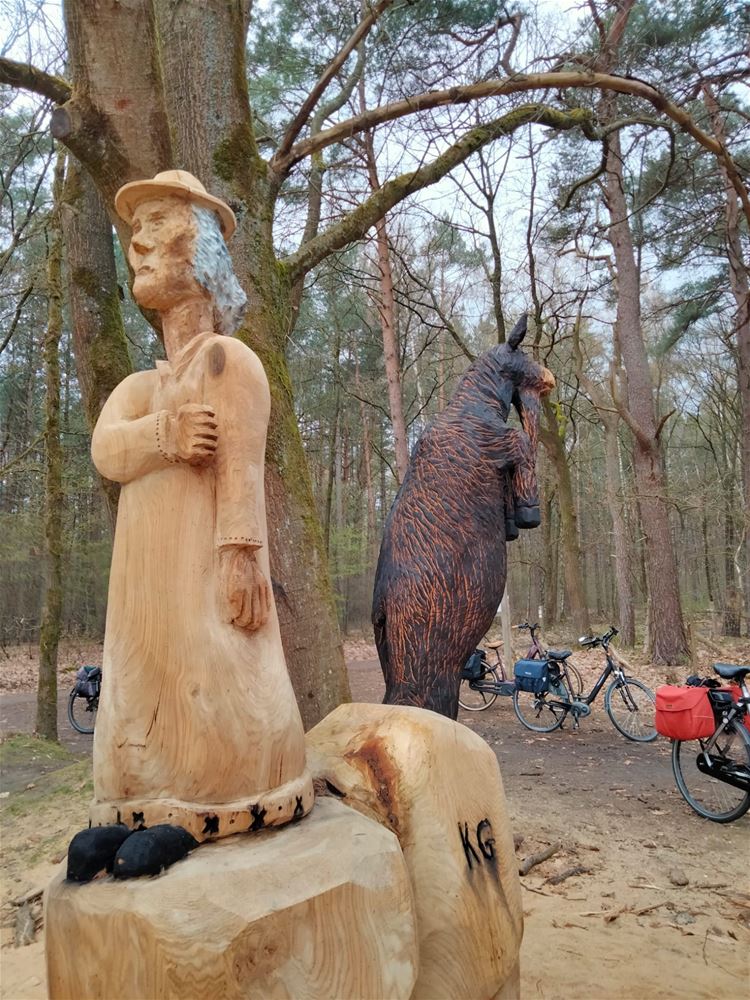 De groep besloot toch door te zetten en koos voor een kortere terugweg, althans dat was de bedoeling. Via het Hobos passeerden ze nog langs het fraaie houtsnijwerk van de Bokkenrijders, waar even halt werd gehouden.