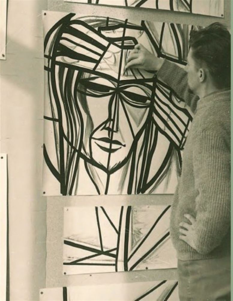Foto van Bert Vonk bij een van zijn ontwerpen voor de Salvator-Mundikerk: archief Albert Vonk in KADOC, Salvatorianen.