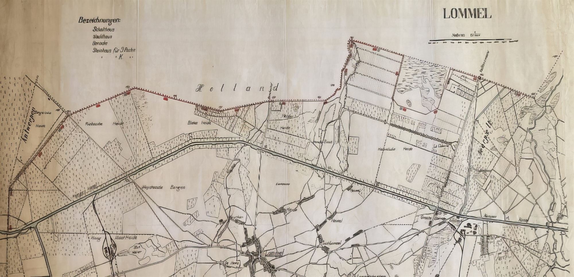 (foto onder: de Dodendraad van bij de Dommel tot de Blauwe Kei: de rode vakjes zijn woonbarakken,