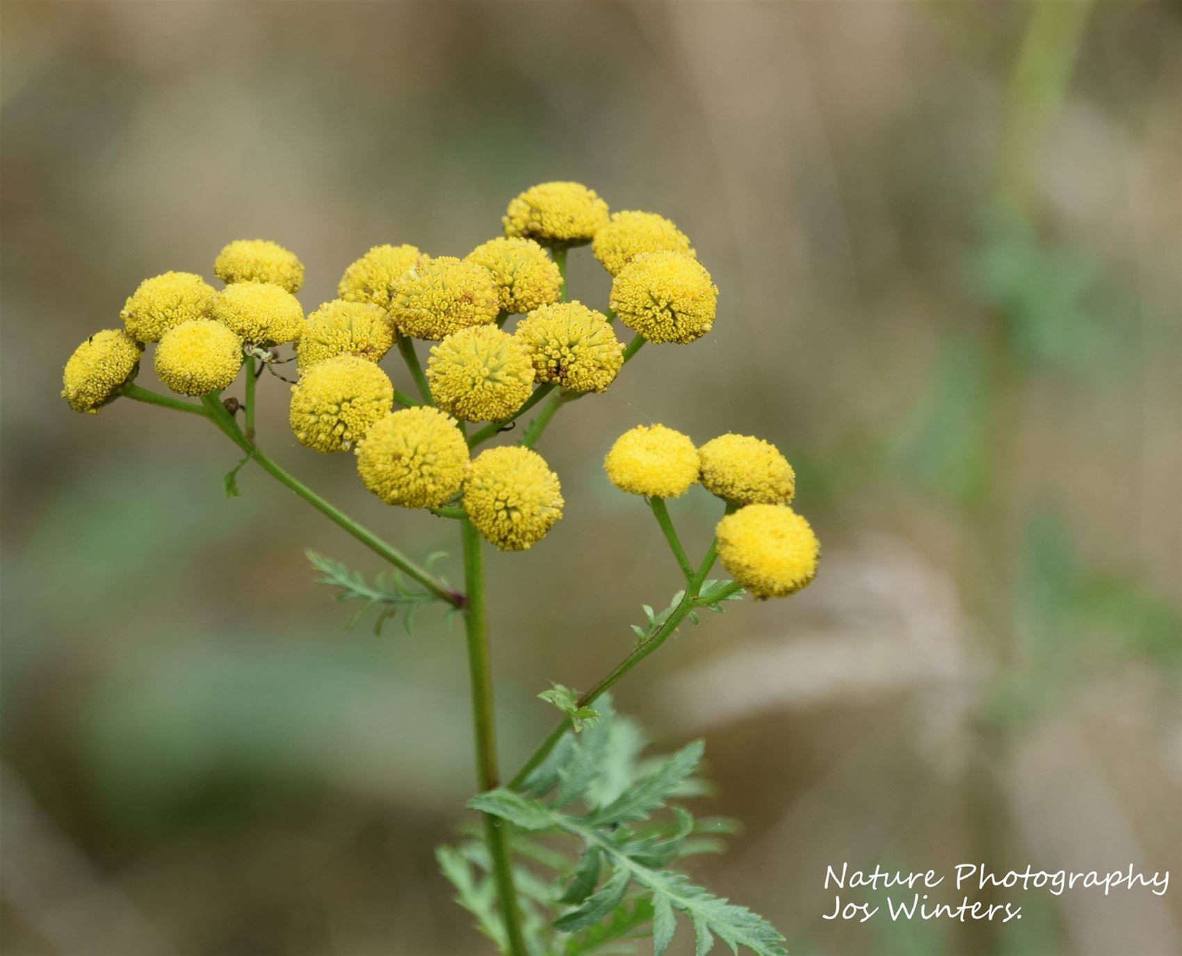boerenwormkruid (Tanacetum vulgare) aan. De plant, herkenbaar aan de felgele bloemknopjes, behoort tot de composietenfamilie en bloeit van juli tot laat in de herfst.