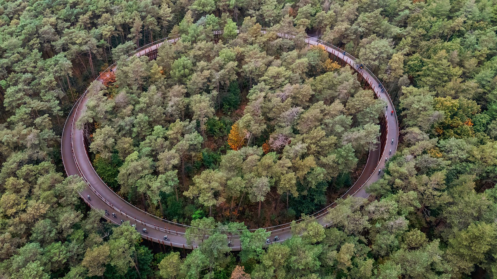 De spectaculaire fietsconstructie in het natuurgebied Pijnven laat fietsers via een cirkelvormig pad langzaam omhoog fietsen tot op tien meter hoogte, midden tussen de boomkruinen. Het traject maakt deel uit van het fietsnetwerk in Bosland en groeide sinds de opening uit tot een internationale trekpleister.