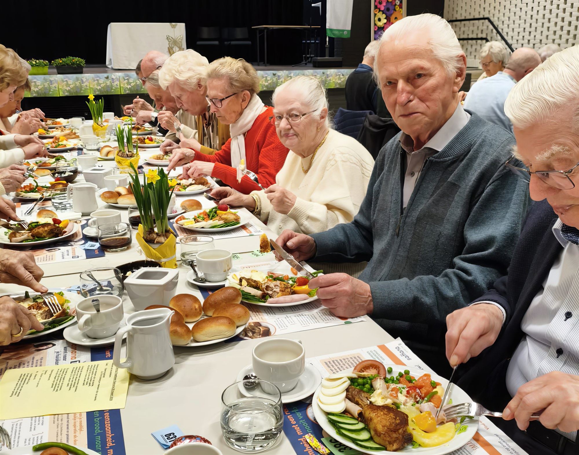 Het feest ging van start met een ingetogen bezinningsmoment. Aansluitend werd een aanwezige jarige in de bloemetjes gezet, wat voor een feestelijk en persoonlijk accent zorgde.