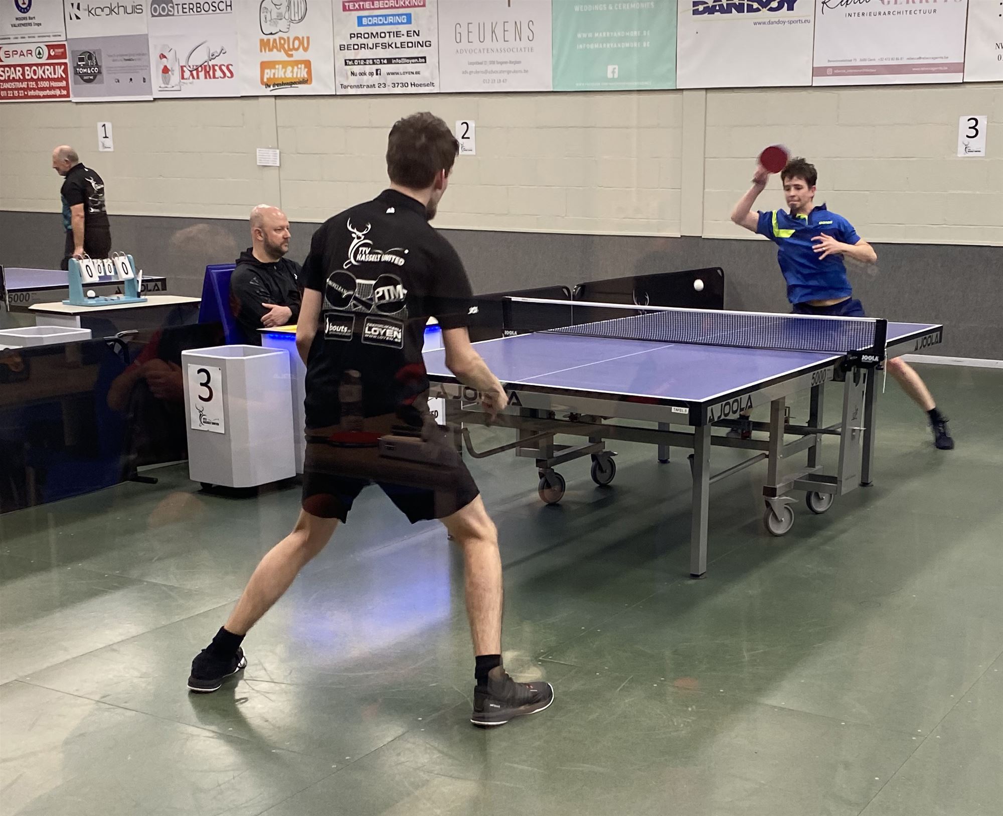 De A-ploeg trok naar Hasselt United en kende een sterke start. Na een 1-5 voorsprong hield het team lange tijd een marge van twee matchen aan. Dankzij Jorne Raymakers was het gelijkspel al verzekerd. Jens en Johan kregen daarna nog de kans om het voordeel naar hun kant te trekken, maar dat lukte net niet. Johan verloor in vier sets en Jens ging in de vijfde en beslissende set nipt onderuit met 12-10. Het werd uiteindelijk 8-8, wat opnieuw een degelijk resultaat opleverde.
