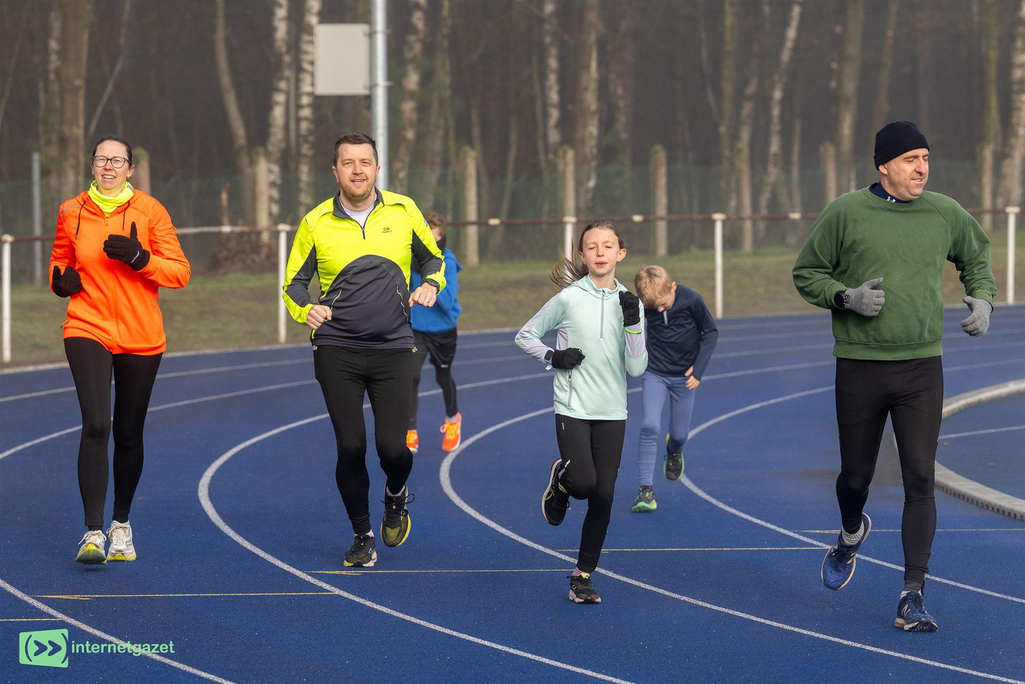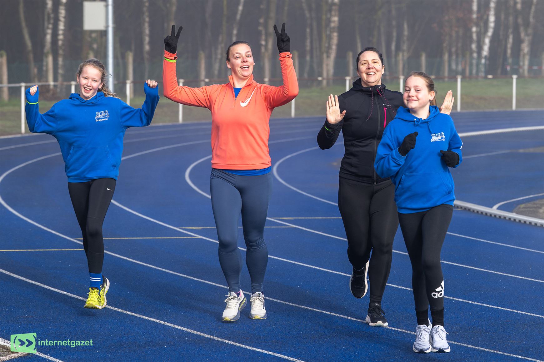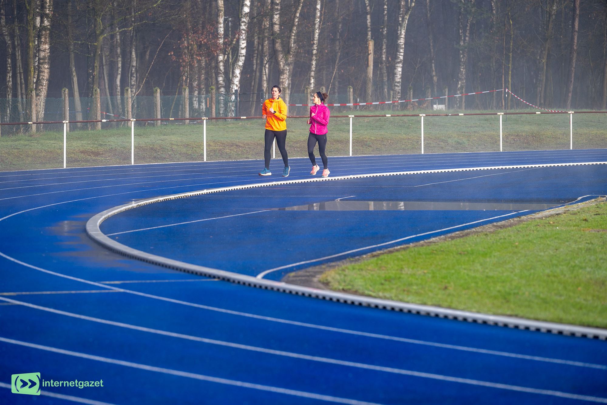 mooie blauwe atletiekpiste langs het Duinenstadion, alvorens het parcours de lopers de bossen in stuurde.