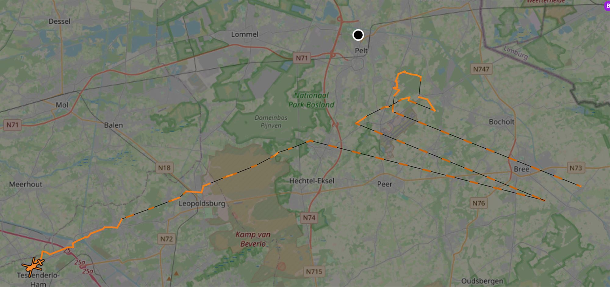 UPDATE De helikopter is ondertussen terug naar Brussel vertrokken. Volgens onze reporter in de buurt van Kleine Brogel steeg die op zonder enige lichtsignalen uit te sturen. Dat blijkt ook uit het vliegpatroon op de foto hier onder. Pas nadat de heli Leopoldsburg was gepasseerd schakelde die terug over op de normale modus.